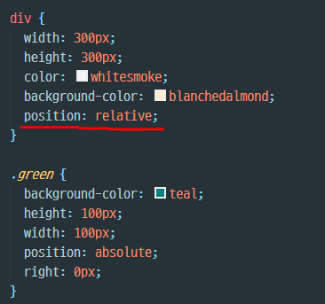 → position: absolute는 relative 속성값을 갖고있는 부모 엘리먼트를 기준으로 움직인다. relative 속성값을 갖고있는 부모 엘리먼트가 없는 경우에는 body를 기준으로 움직이고, 기준을 다른 부모 엘리먼트로 잡고 싶다면 해당 엘리먼트의 position 속성을 relative로 설정하면 된다.