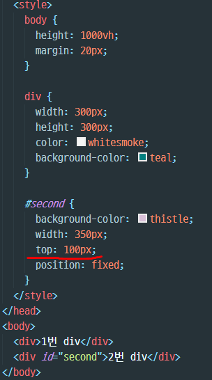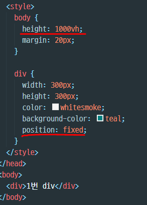 - fixed속성값을 사용하면 스크롤을 내려도 요소의 위치가 고정되어있게 된다.