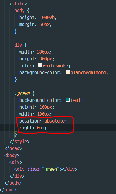 - 초록색 div에 position: absolute; 와 right: 0px; 를 설정했다. 그랬더니 위의 우측 사진처럼, 초록색 div가 화면 가장 오른쪽으로 이동한 것을 알 수 있다. 코드 상으로 보았을 때 어디에도 relative 속성을 가진 엘리먼트는 없다. 왜일까?
