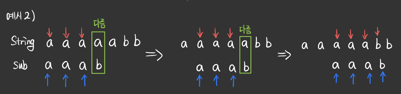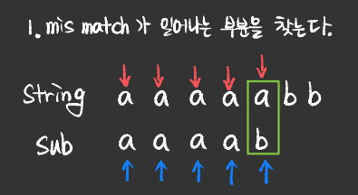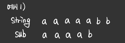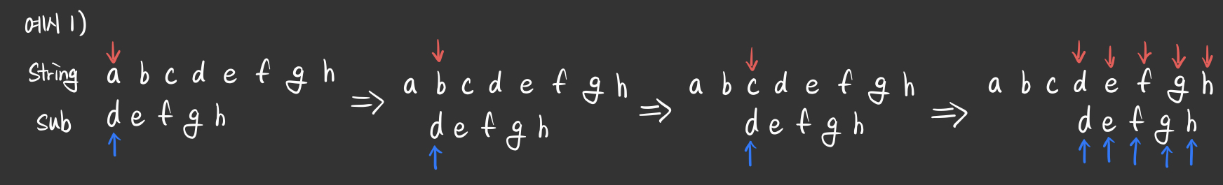- string과 sub_string 각각에 포인터를 생성하여 각 문자를 비교하는 알고리즘이다.