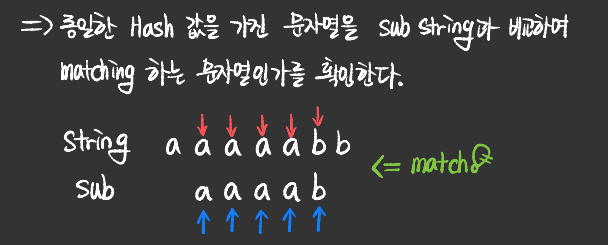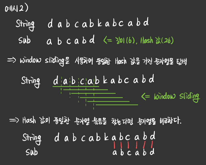 - 즉, sub_string의 hash 값과 동일한 hash 값을 가진 string의 문자열을 찾는 방식이다.