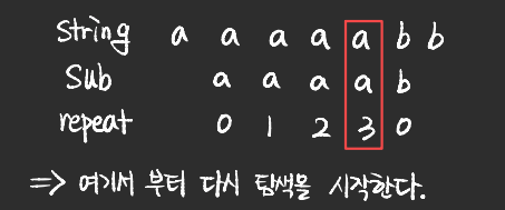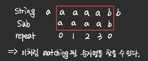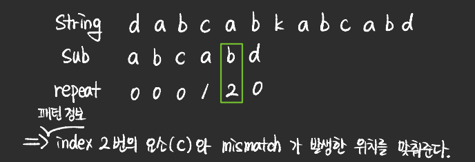 - 반복되는 문자열에 대한 패턴정보를 기반으로 matching 문자열을 찾는 방식을 KMP 알고리즘이라고 한다.