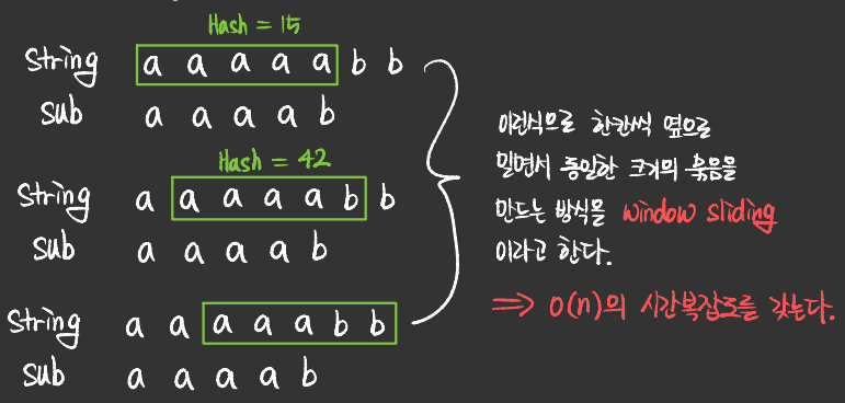- sub_string의 길이만큼 string의 문자들을 묶어서 hash 값을 구한다.