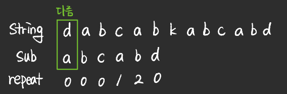 - 위의 예시처럼 string1에서 sub_string과 동일한 부분이 있는지를 찾게된다.