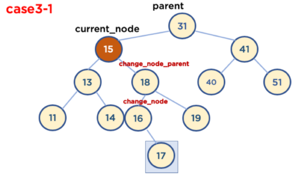 - 전략 1번) 삭제할 노드(15번)의 오른쪽 자식 중 가장 작은 노드(16번)를 삭제할 노드의 부모노드(31번)와 연결한다.