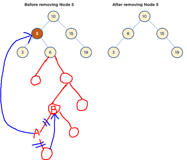 - 위의 두가지 경우 중 한가지 방식을 사용하면 되는데, 간과하는 부분이 존재한다. 1번 방식을 사용하는 경우, 5번노드를 분기점으로 우측 노드 중 가장 작은값을 A노드라고 해보자. A노드를 5번노드의 자리에 올려놓으면 A노드의 부모노드(B노드)가 기존의 A노드의 자리를 더이상 가리키지 않도록 해야한다. 더불어, A노드를 분기점으로 A노드의 우측에 있을 수도 있는 노드를 B노드의 좌측에 연결 시켜야 한다. 기존 A노드의 위치에서 좌측에 자식노드가 없는 이유는 A노드가 가장 작은 값이기 때문이다. (아래 사진참고)