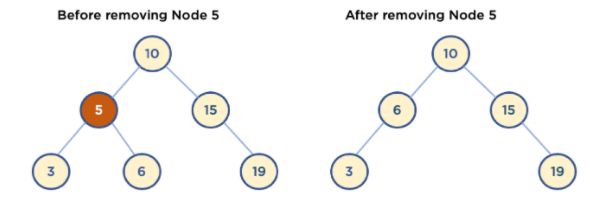 1. 아래 사진처럼, 삭제할 5번 노드의 오른쪽 자식 중에서 가장 작은값을 10번 노드(5번의 부모노드)가 가리키도록 한다.