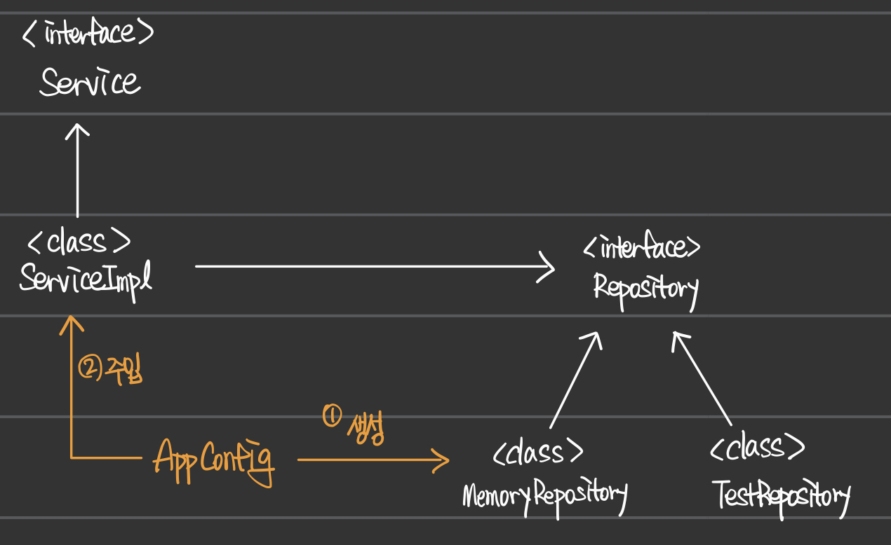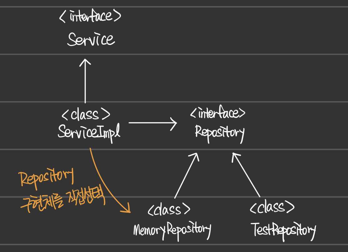 - 위의 예시에서 Service의 구현체인 ServiceImpl은 Repository의 구현체인 MemoryRepository를 사용한다.
