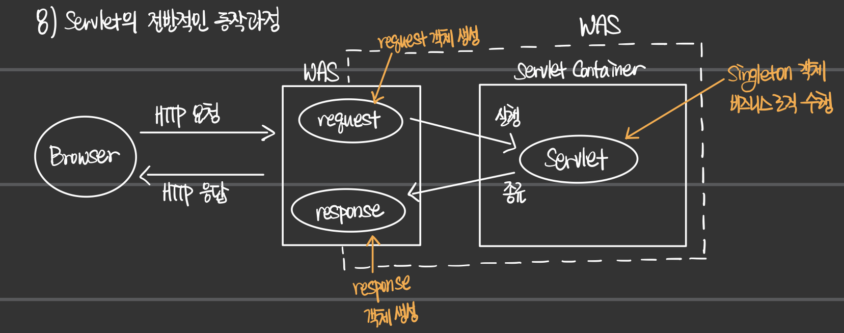 - Servlet을 사용하는 이유는 WAS가 비즈니스 로직 처리만을 수행할 수 있는 환경을 제공하기 때문이다.