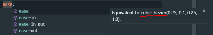 - Transition의 default로 사용할 수 있는 속성값은 linear/ease-in/ease-out/ease-in-out, 이렇게 총 4가지 이다. 이 각각의 속성값에 대한 설명을 읽어보면 Equivalent to cubic-bezier라는 설명을 볼 수 있다. (아래 사진참고)