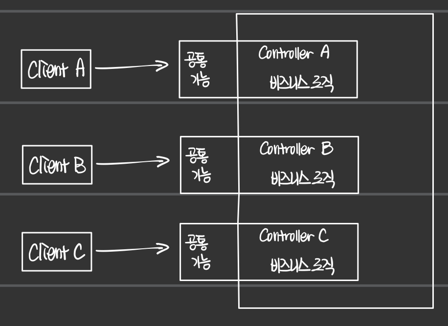 - 중복적인 코드가 작성될 수밖에 없는 이유는 Controller마다 각각의 진입점을 갖기 때문이다.