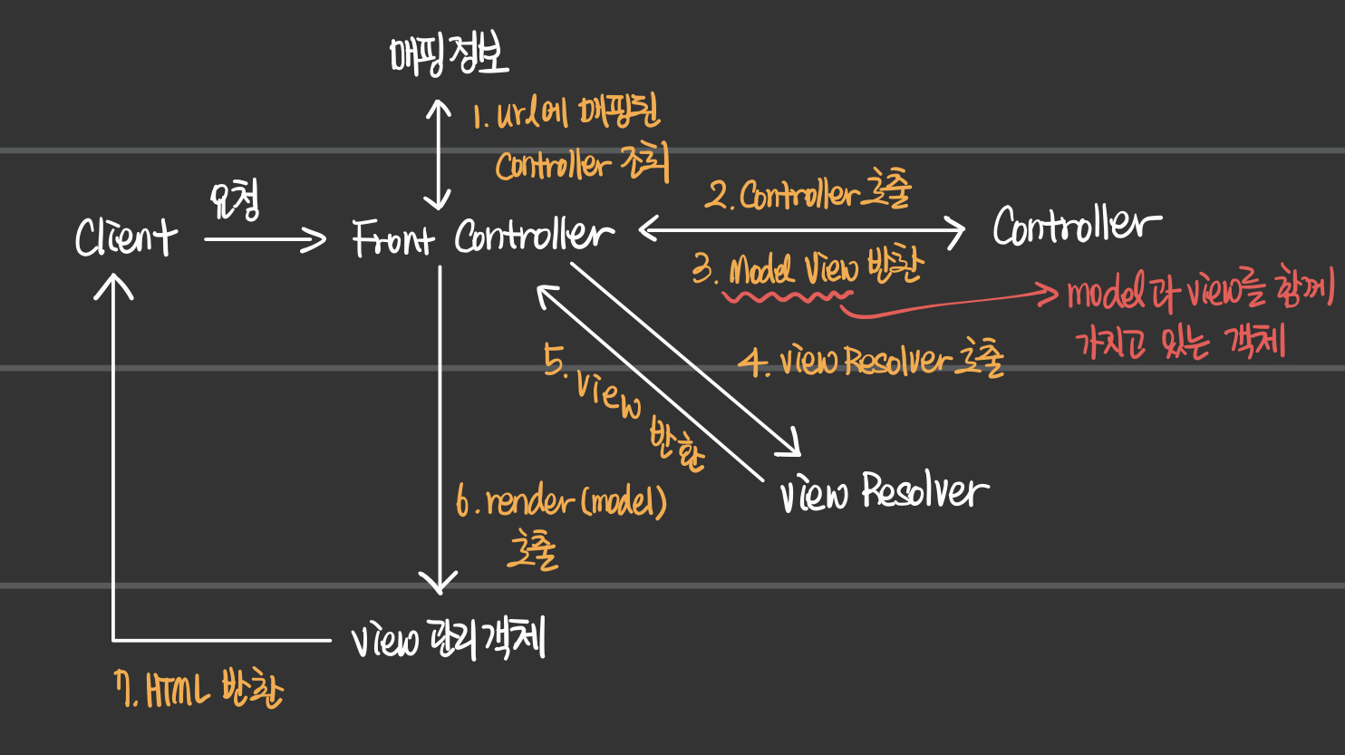 - 위에서 확인한 Front Controller의 그림은 Front Controller의 큰 흐름을 표현한 것이다.