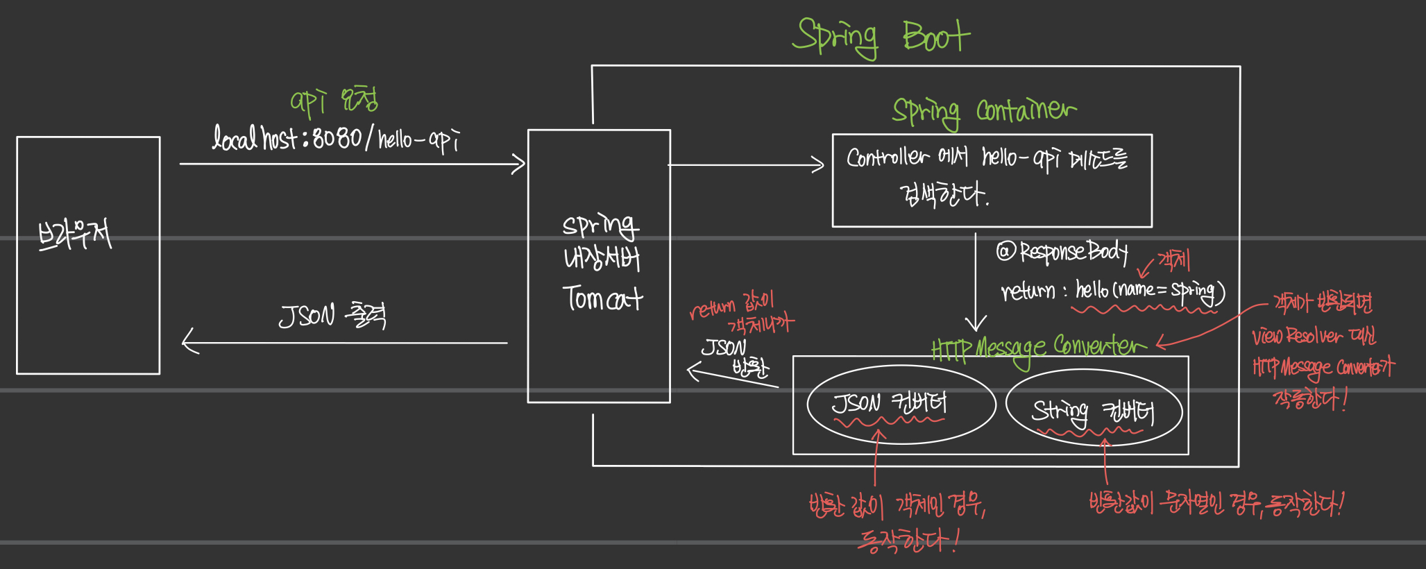 - 그러므로 개발자는 Request body를 읽거나 Response body를 작성하는 로직에 관여하지 않는다.