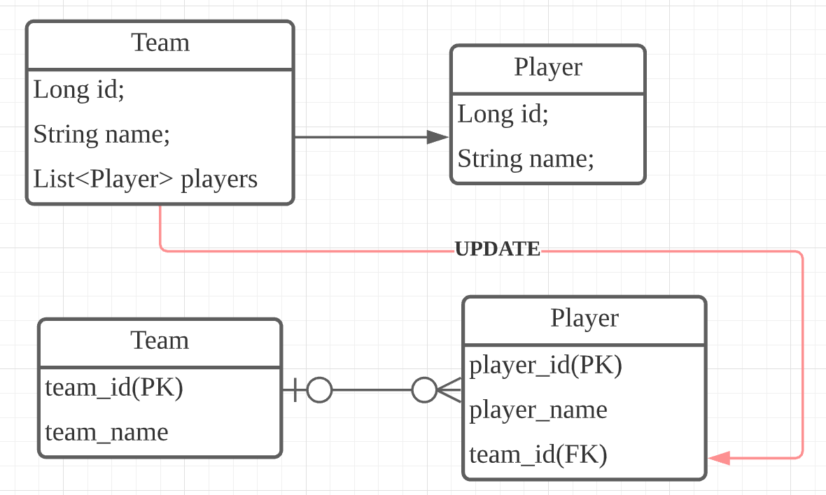 - 연관 관계의 주인이 Team Entity가 되기 때문에 Team 객체에서 Player의 team_id 값을 변경하는 경우