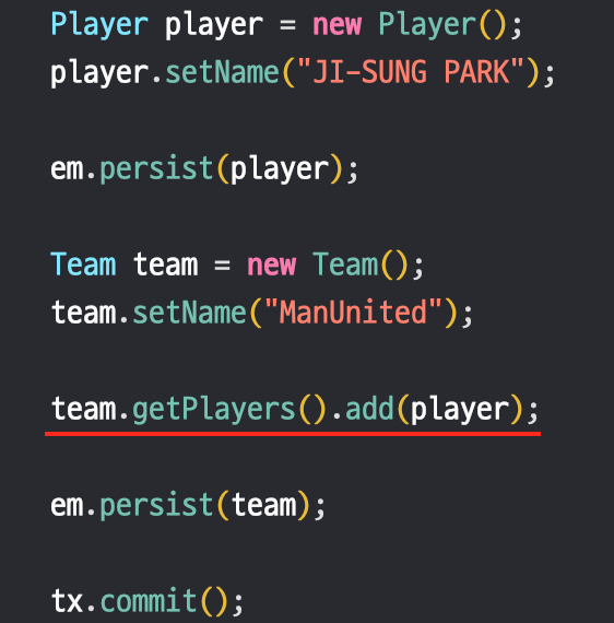 - team 객체를 이용하여 player 정보를 삽입하는 것처럼 보이지만,