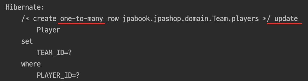 - 콘솔에 출력된 내용을 읽어보면 one-to-many 관계에 의해 player 테이블에 update가 실행된 것을 볼 수 있다.
