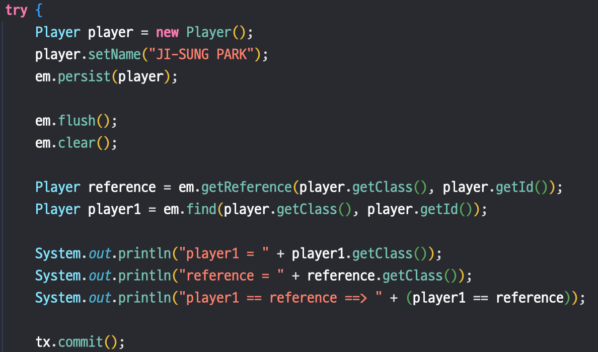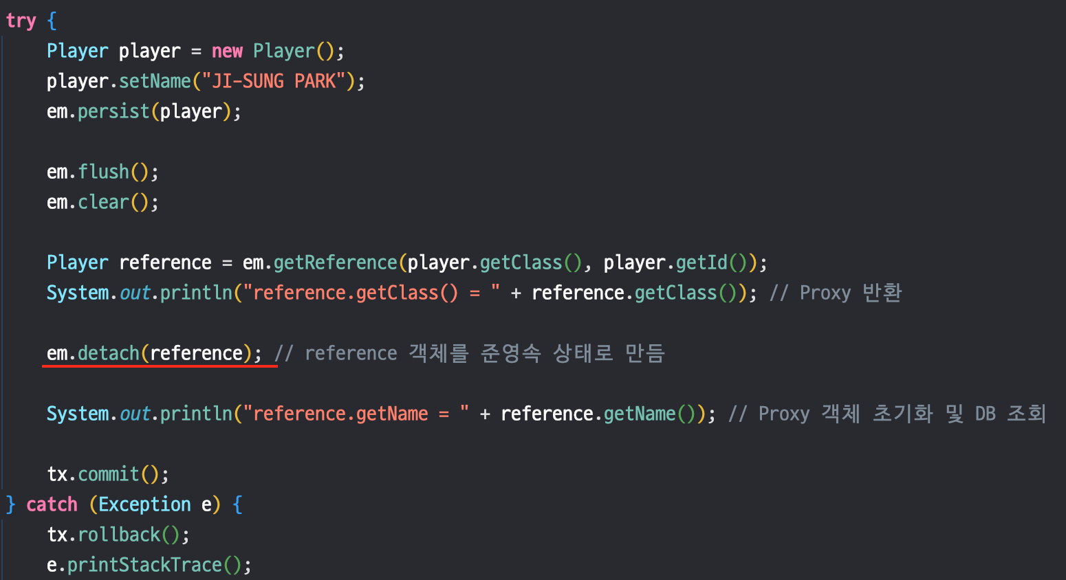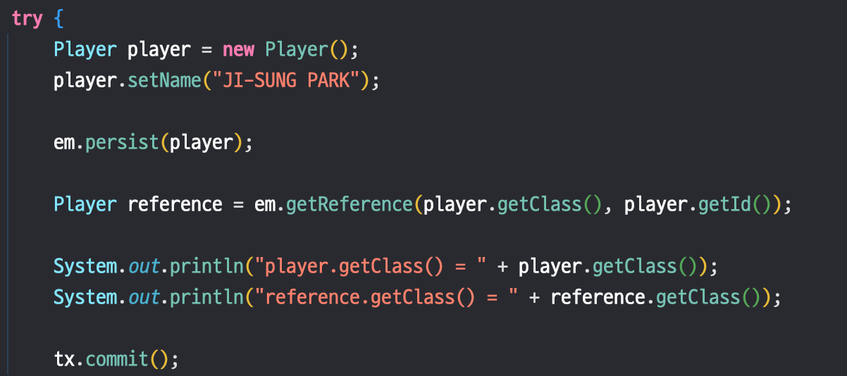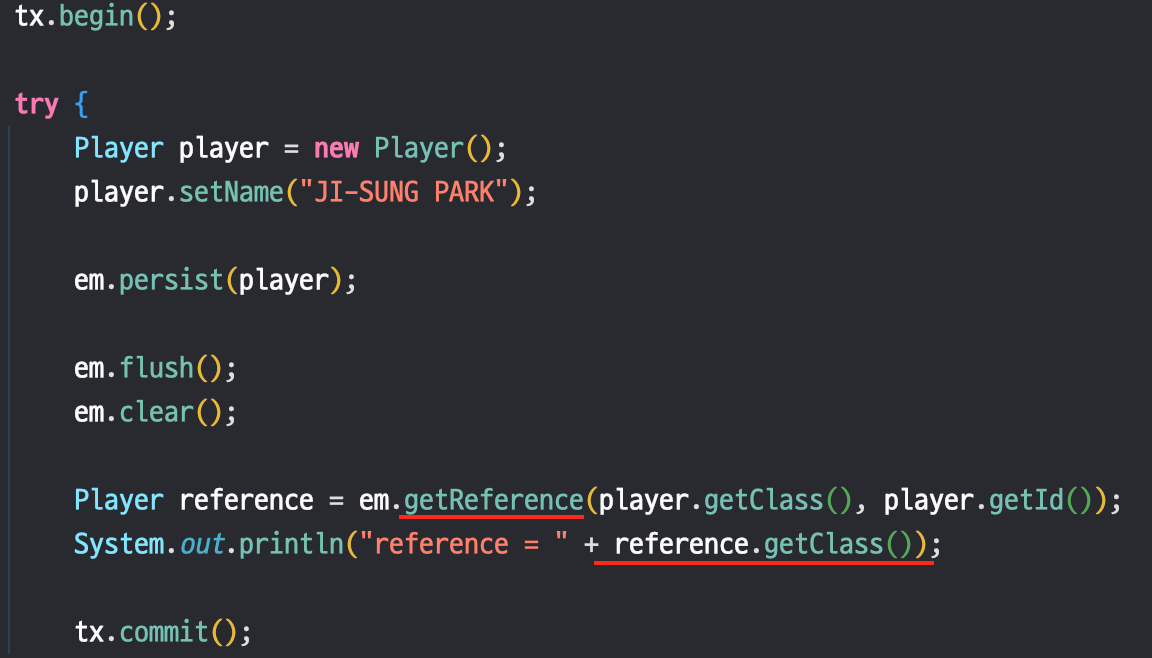 - 그 후에 getReference() 메서드를 호출하여 player 객체를 조회하였다.