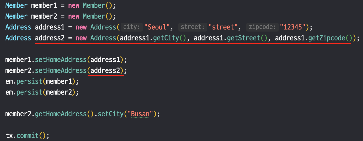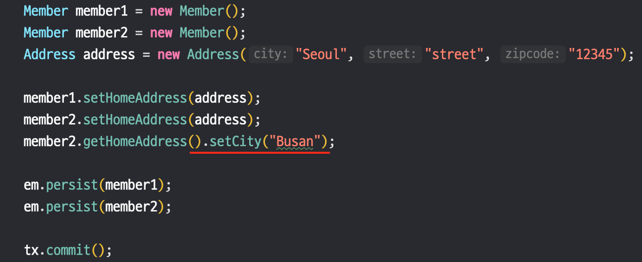 - 즉, member2.getHomeAddress().setCity()는 member1에서 사용한 것과 동일한 Address 객체의 값을 수정한다.