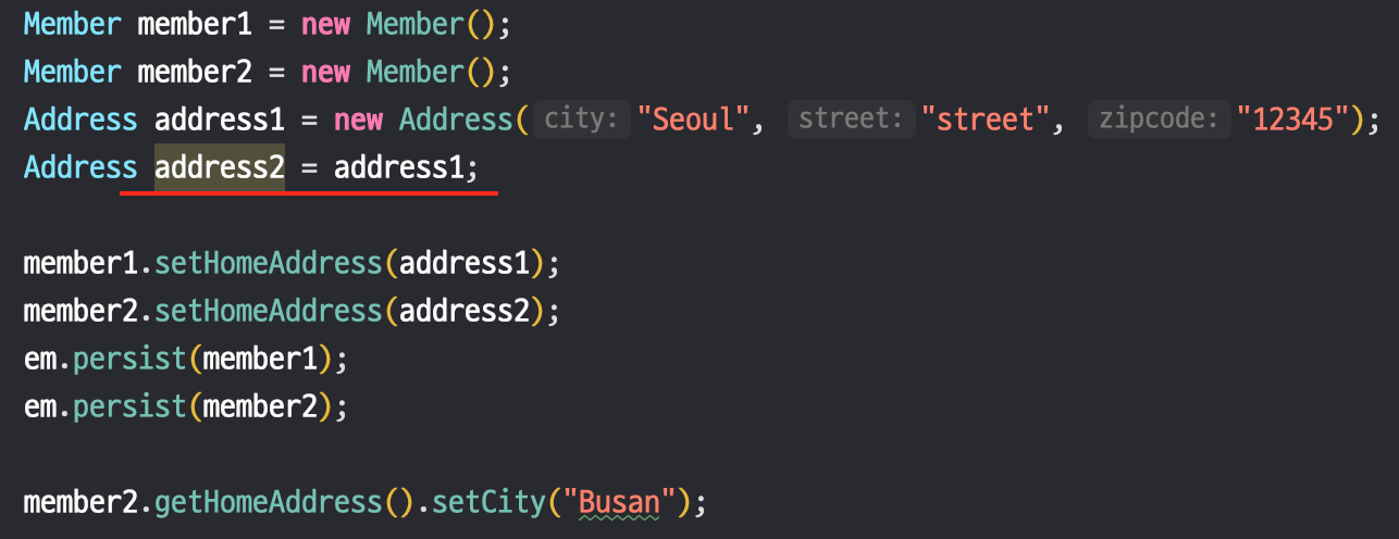 - 즉, member1과 member2는 동일한 Address 객체를 사용하므로 member2에서 변경한 값을 그대로 적용하는 것이다.