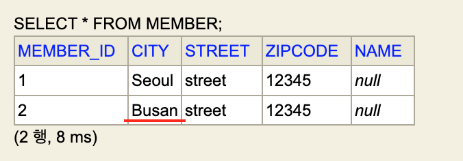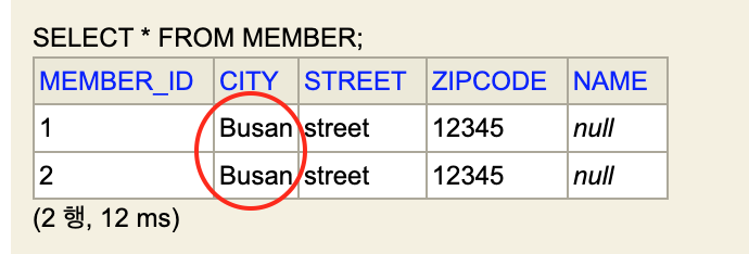 - 그러나 member1의 도시 주소도 Busan으로 변경된 것을 확인할 수 있다.