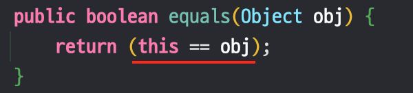 - 위의 사진은 Object 클래스에 정의되어있는 원본 equals() 메서드다.