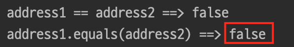 - 그러나 Address 객체를 equals()로 비교했을 때에는 false가 반환된 것을 확인할 수 있다.