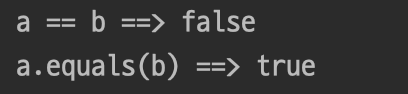 - 객체 a와 b는 서로 다른 객체이므로, 비교 연산자(==)를 사용하여 비교해보면 당연히 false가 나온다. (메모리 주소 값이 다름)