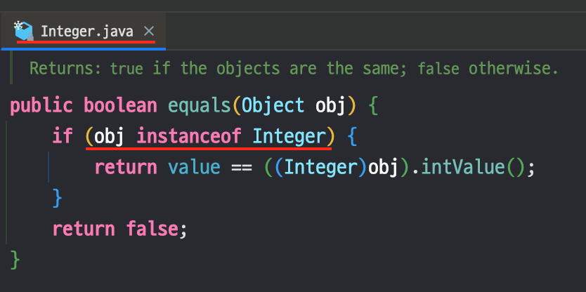 - 위의 사진은 Integer 클래스에 재정의 되어있는 equals() 메서드다.