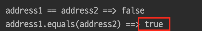 System.out.println("address1.equals(address2) ==> " + (address1.equals(address2)));