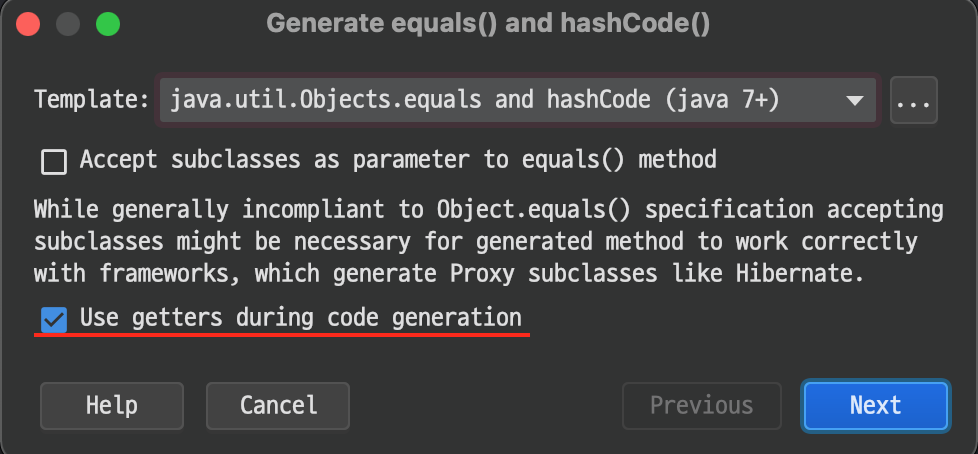 → equals() 메서드 재정의 시 반드시 "Use getters during code generation" 옵션을 사용하자.