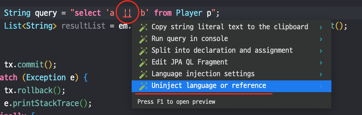 - 위의 사진에서 볼 수 있듯이, 쿼리는 문자열인데 이를 IDE에서 쿼리문처럼 표현한다.