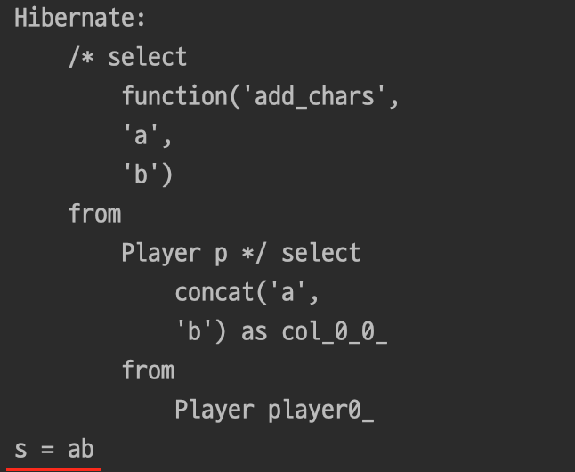 String query = "select function('add_chars', 'a', 'b') from Player p";