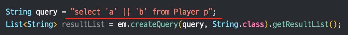 - Hibernate의 경우, CONCAT과 동일한 연산자를 제공한다.