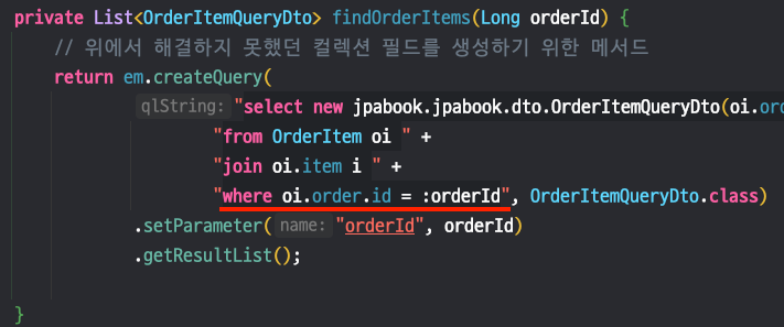 - findOrderItems() 메서드 내부에서는 다음과 같은 JPQL을 이용하여 OrderItem의 값을 받아온다.