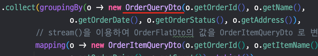 - 그러므로 groupingBy()의 기준은 OrderQueryDto 클래스에 다음과 같이 설정해준다.