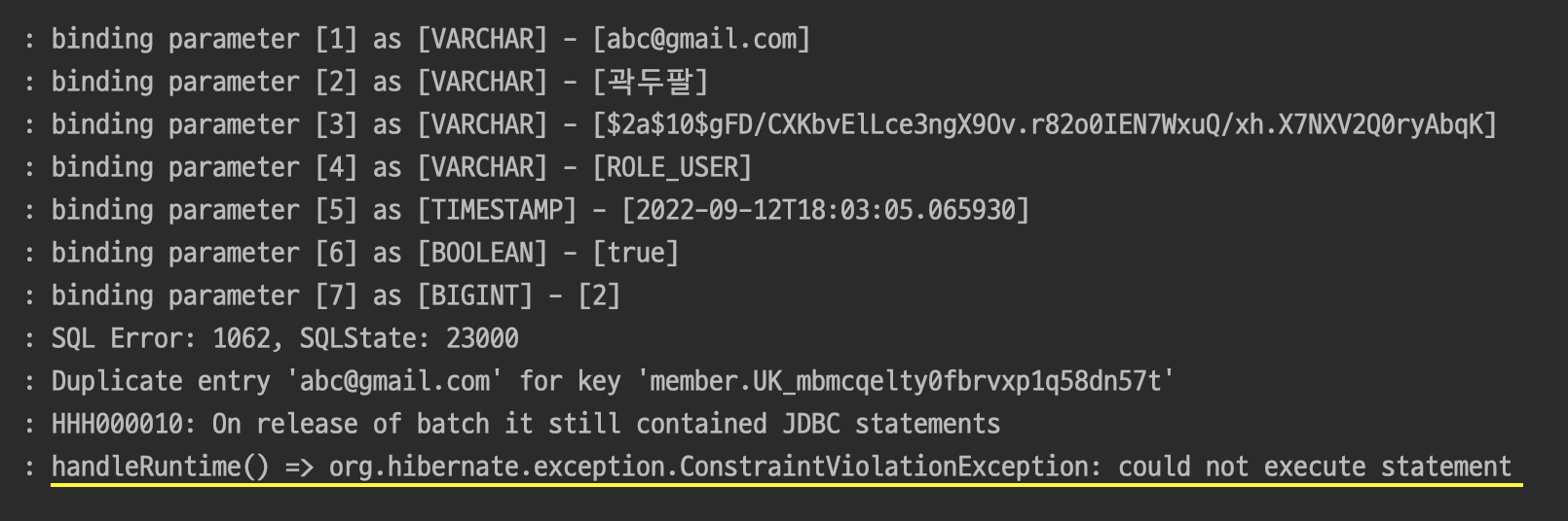 - 당연히 이메일 중복 확인 로직을 해당 메서드에 집어넣으면 충분히 걸러낼 수 있는, 예방할 수 있는 예외이다.
