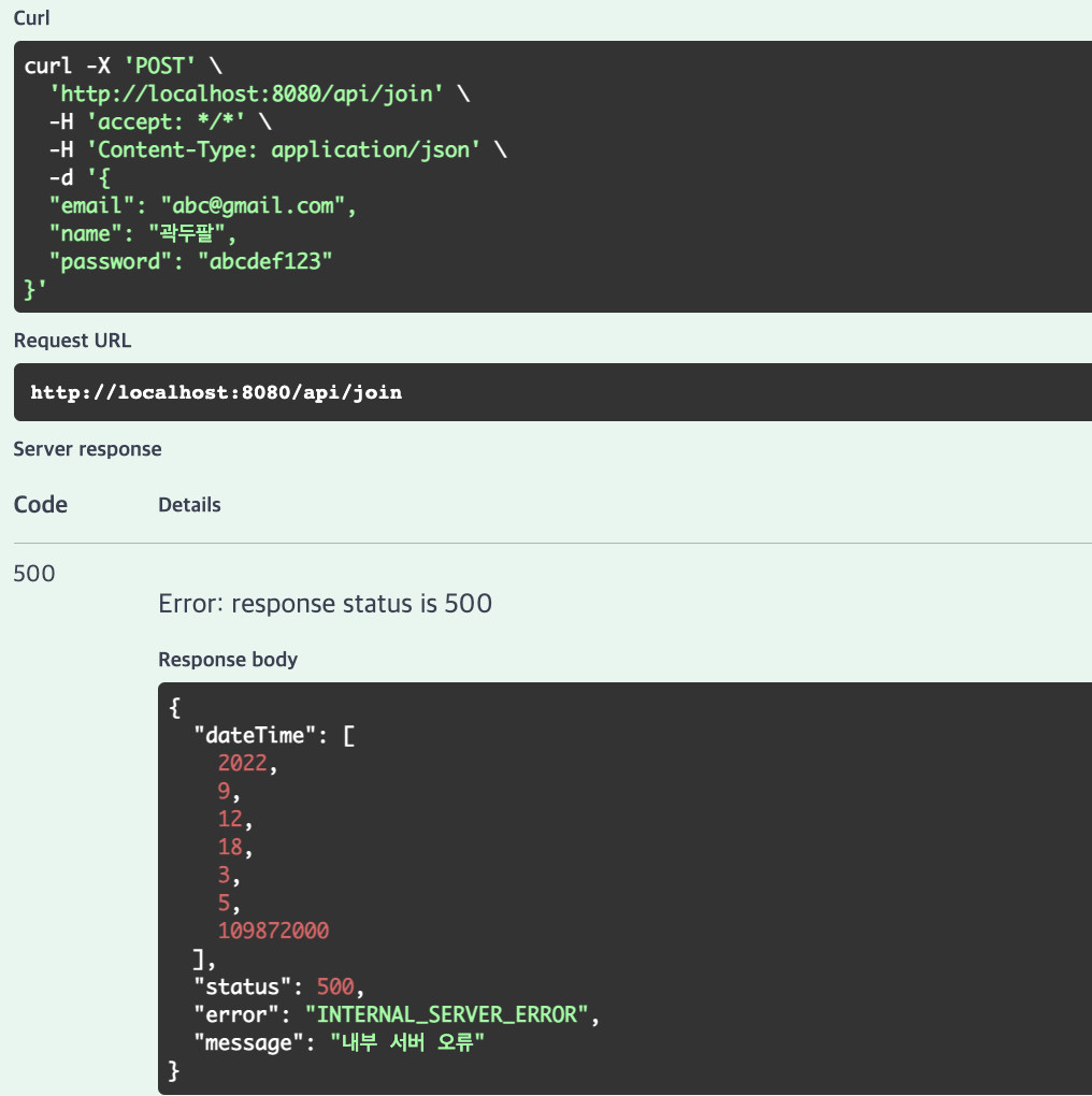 - API 서버를 테스팅하면서 일부러 중복 값을 이용한 회원가입을 시도해보았다.