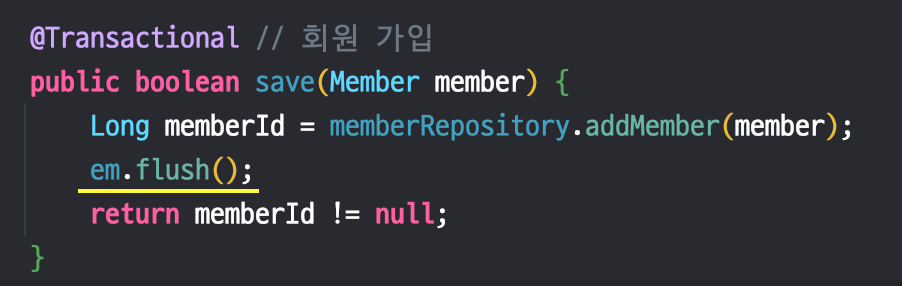- 다음 사진과 같이 EntityManager를 사용하여 Flush()를 강제 호출하면 된다.