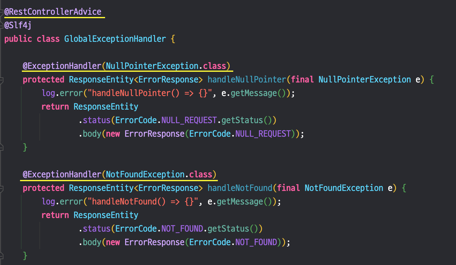 - 그리고 해당 클래스에 @RestControllerAdvice를 붙여주었다.