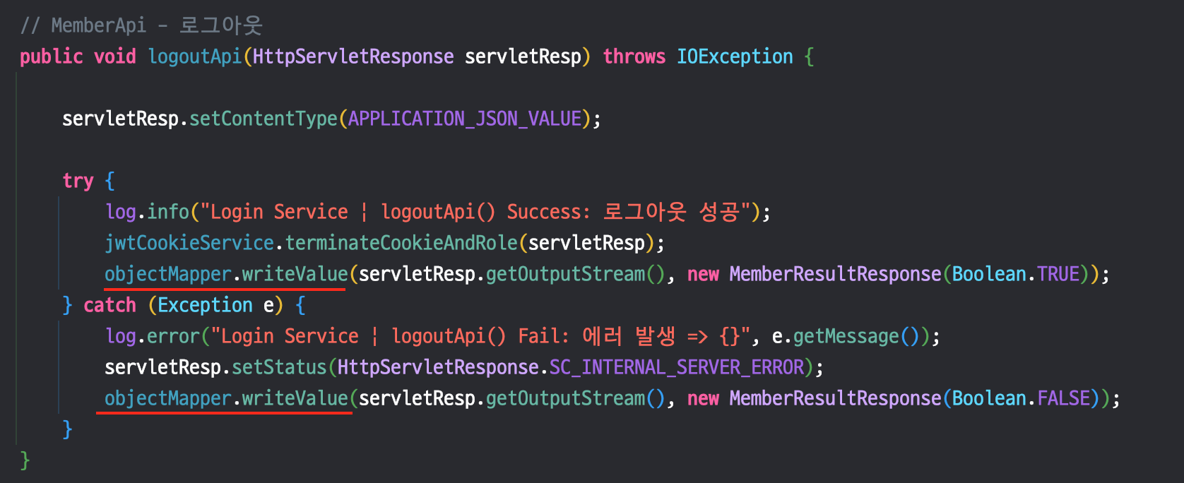 - 위의 logoutApi() 메서드에 작성했듯이, Service에서 ObjectMapper를 이용한 응답까지 처리한다.