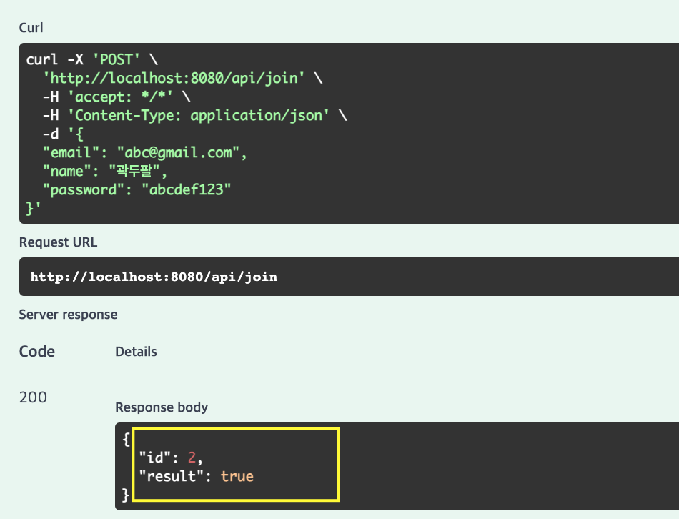 객체가 반환되는 것이 아니라 회원이 등록되었다는 StatusCode 200의 응답이 반환되는 것이다.