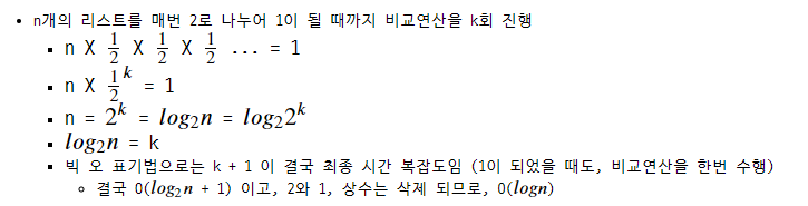 - 결론으로, 이진 탐색의 시간복잡도는 O(log n)이다.