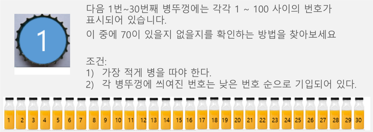 - 1~100 사이의 난수가 30개의 병뚜껑에 적혀있고 이 중에 70이 있는지 찾아야 한다.