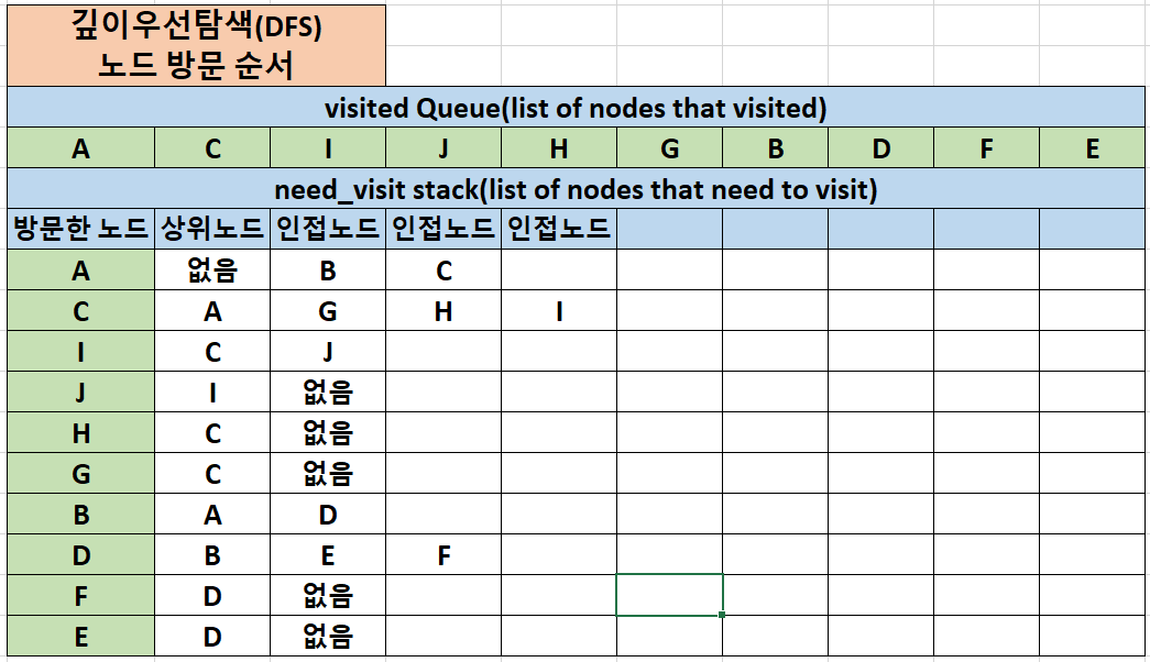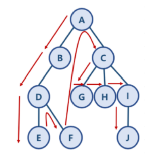 - DFS 동작방식: A - B - D - E - F - C - G - H - I - J