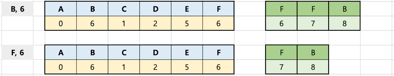 6단계 - 우선순위 큐에서 (B, 6)과 (F, 6)을 꺼내와 인접한 노드와의 거리를 계산한다.