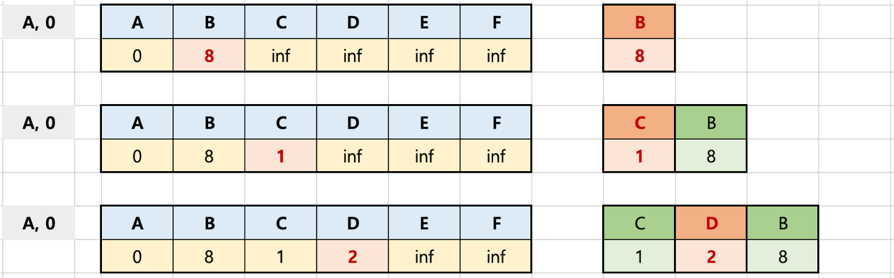 7단계 - 우선순위 큐에서 (F, 7)과 (B, 8)을 꺼내와 인접한 노드와의 거리를 계산한다.