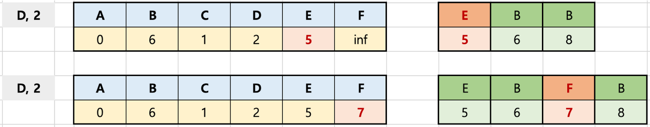 - 기존의 A → F 경로는 inf(무한대)이고, A → D → F 경로의 거리는 7이다. (업데이트 수행)