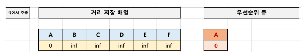 2단계 - 우선순위 큐에 저장된 첫 정점과 거리(A, 0)를 꺼내와 인접노드와의 거리를 계산한다.