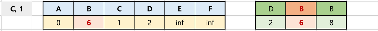 - A에서 C로 가기위한 경로가 A → C→ D(3) 보다 A → D(2) 가 더 짧은 거리이므로 업데이트 하지 않는다.