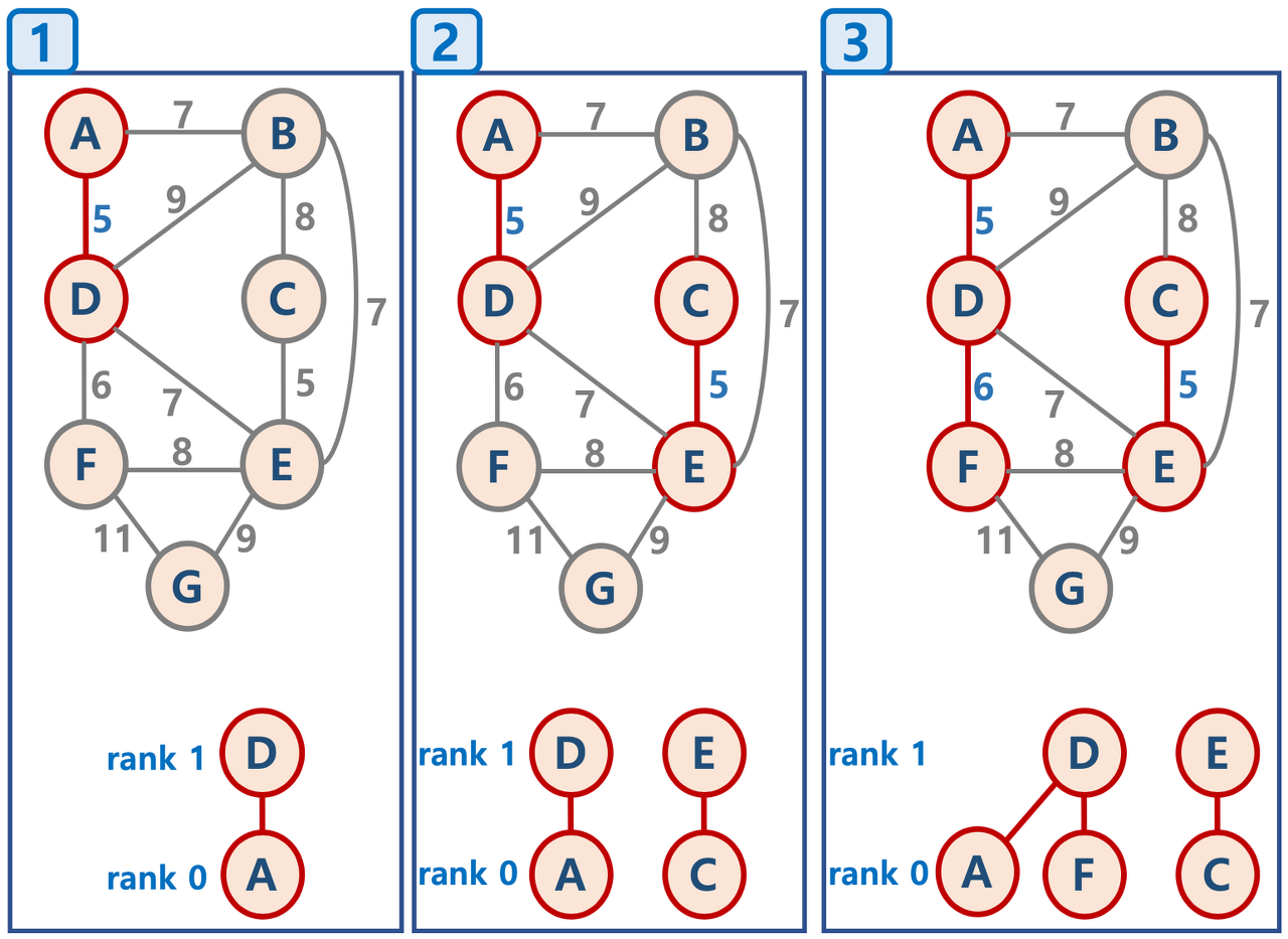 - 모든 간선을 가중치(비용)를 기준으로 정렬하고, 비용이 작은 간선부터 양 끝의 두 정점(루트노드)을 비교한다.